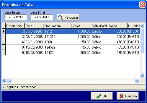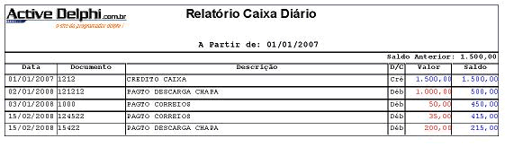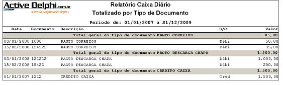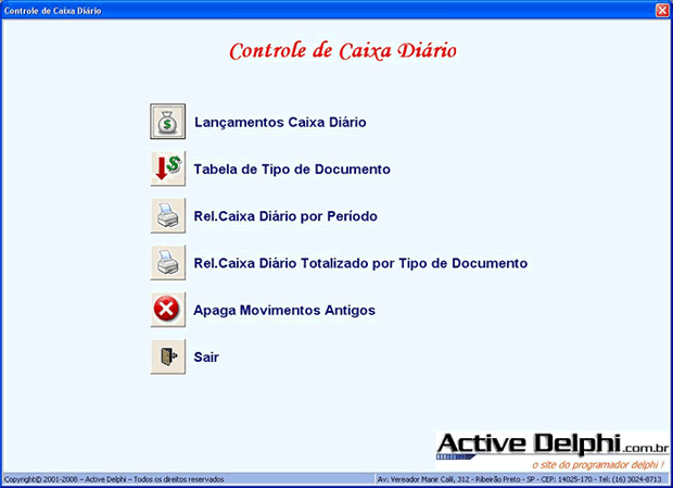 | Sistema de Controle de Caixa com Fontes em Delphi 7 e Firebird Conteúdo: - Todos os fontes do sistema em Delphi7 - Todos componentes utilizados no projeto com os fontes - Manual de utilização - CD com instalador do software - Banco de dados Firebird Visão Geral Software para controle de caixa diário de qualquer estabelecimento comercial ou até mesmo contas pessoais. Permite o cadastramento de grupos financeiros, ou tipos de documentos, onde os mesmos podem ser de crédito ou débito, facilicitando assim a visualização por meio de relatórios agrupados ou não. O usuário pode fazer o controle do caixa diário, mensal ou pelo período que achar necessário. Podendo também excluir lançamentos passados, informando apenas a data desejada. Funcionalidades: - Cadastro de Grupos Financeiros/Tipos de Documentos - Lançamentos de Crédito ou Débito - Relatório por período com opção de agrupar e totalizar pelos grupos financeiros - Opção para apagar lançamentos antigos Veja abaixo algumas telas do sistema: